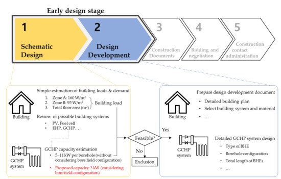 The design capacity of a ground-coupled heat pump system (GCHP) during the early design stage of a construction project is determined through the application of a set capacity per unit of equipment. In this work, GCHP systems refer to a heat pump coupled with vertically installed borehole heat exchangers (BHEs). However, the ground-coupled heat pump system is distinct such that the capacity and efficiency of the system are largely dependent on the design of the ground heat exchanger constituting the heat source loop, which may cause problems such as increased costs following an inaccurate early design stage. In general, the detailed estimation of an equipment system’s capacity is determined upon the completion of the building design by selecting the appropriate equipment factors to counter the acquired loads [1]. However, before the design development stage, the estimation of the approximate capacity and cost via a simple method in order to factor in the size and limitations of the entire construction project is common. The American Institute of Architects (AIA) divides the construction project process into five stages as shown in Figure 1 [2].