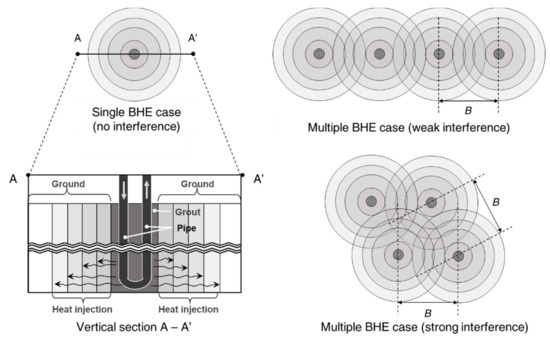 - Koohi-Fayegh, S.; Rosen, M.A. Examination of thermal interaction of multiple vertical ground heat exchangers. Appl. Energy 2012, 97, 962–969. [Google Scholar] [CrossRef]