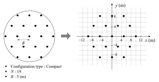 If the thermal properties of the ground are uniform, the heat interference effect in a specific configuration can be evaluated by the sum of the distances between BHEs as expressed in Equation (1) [30]: S is the total distance, N is the total number of BHEs, and and are the coordinates of the individual BHE as Cartesian coordinates. As an example, Figure 3 shows how to calculate S using Cartesian coordinates, and the case is the cylindrical configuration proposed in the original DST model. S can be calculated by inputting the coordinate values of the BHEs into Equation (1).