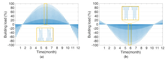Test building load: (a) cooling-dominant case and (b) heating-dominant case.