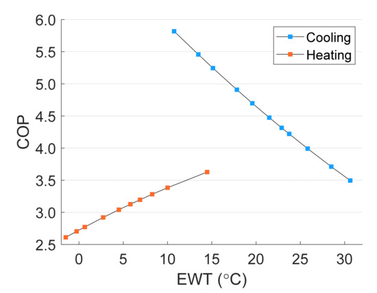 Heat pump entering water temperature (EWT)–coefficient of performance (COP) curve for heating and cooling cases.