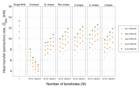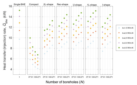 Figure 6 and Figure 7 summarize the (kW) obtained after performing TRNSYS simulations for all the cases shown in Table 2. Figure 6 and Figure 7 each consist of seven subgraphs, and one graph corresponds to one configuration case. In Figure 6 and Figure 7, starting from the single BHE case with one BHE, the compact configuration and irregular cases (2L-, Rec-, U-, 1L-, and I-shape) are shown in the same order presented in Table 1. The x-axis of each graph represents the number of BHEs, and the y-axis represents , the heat transfer rate per borehole for each case. The upper and lower limits for in the two figures are matched so that the differences between cooling and heating can be more readily compared. In each subgraph, when the number of BHEs is identical, the five marks indicate different ground thermal conductivities. The simulation results for the test cases are presented numerically in Appendix A, Table A1 and Table A2.