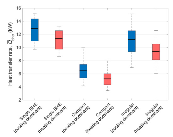 Figure 9 shows a box plot showing the range of according to the BHE configuration depending on the cooling/heating load case, and Table 4 outlines the median values of shown in the box plot. The range expressed in the box plot shows the range of for each configuration when the range of k is 1.5–3.5 W/m·K and the number of BHEs changes. The minimum/maximum values for each configuration are determined by a combination of the minimum/maximum value of the ground thermal conductivity and the minimum/maximum number of BHEs per configuration. For example, in the case of a compact configuration, the minimum value is obtained when the ground thermal conductivity is the lowest and the number of BHEs is 271.