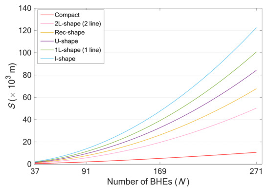 When these patterns are compared to the trend shown in Figure 6 and Figure 7, for configuration types such as the case of an irregular configuration wherein the effects of heat interference decrease as the number of boreholes increases, the S value increases rapidly, and for a high-density configuration, as in the case of a compact configuration, the S value shows a relatively gentle increase compared to in the other configurations. In other words, each BHE configuration type has its own N–S curve, and increases as the number of BHE increases with a sharp increase in the N–S curve, and decreases when the slope of the increase rate is small. In addition, if a configuration exhibits a specific increase in the N–S curve, the configuration is expected to maintain a constant as the number increases; this point will be further investigated in a future study.