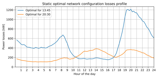 The optimized network configuration for the net load profile at a particular time is given by (3). Given the asynchronism between net load profiles introduced by PV generation, the optimal configurations for the PV peak time and for the night load peak time are very distinct. Figure 2 shows the losses profile obtained for two different optimal configurations: one optimized at 13:45 and another optimized at 20:30. As expected, each configuration performs better than the other in the vicinity of the period for which it was optimized. This shows that none of these configurations alone would be optimal for the whole day as a static configuration, and that a dynamic configuration that would swap between the two configurations could bring significant benefits throughout the day.