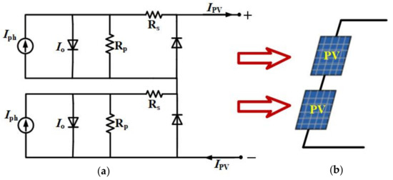 PV array including two series-connected modules (a) Circuitry diagram; (b) Block diagram.