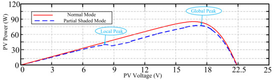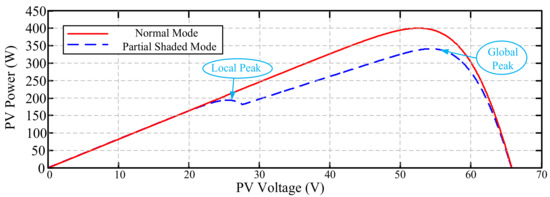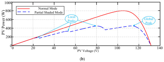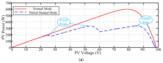 During normal weather conditions, the PV system has only one global maximum, which the MPPT controller tries to follow, whereas the PV system in partial shading has multi-maximum points, local and global peaks. Hence, if the MPPT controller is not sufficiently resilient, the MPPT may struggle to locate the real maximum point and be stuck at a local maximum [5]. In this circumstance, the PV system’s output power would be significantly decreased. This can take place due to a passing cloud, obstructions caused by tall buildings, trees, poles, towers, etc., or even damage to one or more modules in the PV array [6,7]. A shunt-connected bypass diode is used to protect the module from hot-spot damage when a section of the PV module is shaded. However, by using this diode, the output power is decreased greatly, since the power produced from the shaded module is quite unusable. Furthermore, conduction losses occur as the current passes through the bypass diode which can contribute to a further deterioration in device performance [8,9].