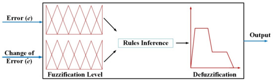 The fuzzy controller is one of the AI methods that is widely used in industrial applications. Using FLC as an MPPT controller provides multiple merits of enhanced efficiency, reliability, and simple design [24,25]. Figure 3 shows the general structure of FLC for MPPT application, which has two inputs and one output. The two FLC input variables are the error E and change of error CE at sampled times j defined by (7)–(9):