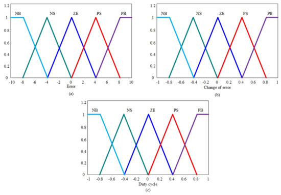 where PPV, IPV, VPV are the PV power, current, and voltage, respectively, at instant j. Figure 4 shows the variables’ membership functions. In the literature, some authors prefer to implement the FLC using five linguistic variables [26,27] or seven linguistic variables [28,29]. The difference between them is not significant, so in this paper, the implementation of the FLC will be made using five linguistic variables as in [2,21,30,31,32].