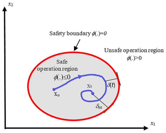 In general, the design objective of control systems is to achieve a specified constrained output. The DSM is a performance index whose independent variable is the distance from a predefined safety boundary. The idea of the DSM is introduced in [22,23]. Let x be the state space in ℜn, and Φ ⊆ x be subspace that defines the safe operation region for some system state variables x ∈ ℜm. Φ can be specified by a set of inequalities, Φ = {x|φi(x) ≤ 0, i =1, …, q}, where φi: ℜm→ℜ. φi (x) > 0 is the unsafe operation as shown in Figure 5, and ∂Φ = {x|φi(x) = 0, i =1, …, q} ⊂ Φ is the boundary of the safe region, where variable q is the number of defined inequalities and m is the number of state variables relevant to safety. Notice that m ≤ n, where n is the dimension of the state-space. The system trajectory starts from the initial condition, x0, to the operating point xs crossing the state space with varying distance to the safety boundary as shown in Figure 5. In this subspace of state variables, DSM is defined as the instantaneous shortest distance, δ(t), between the current state vector, x, and ∂Φ. Therefore, the DSM can be obtained by solving the following quadratic programming optimization problem: