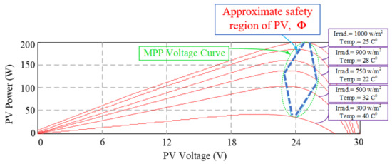 As a result, in the case of the PV system, the state variable relevant to the safety boundary is chosen to be PV voltage and power, x = [VPV PPV]T, and the safe operation region, Φ, is selected to be the subspace that includes the state corresponding to the maximum power points for all possible circumstances of weather conditions, temperature and irradiation. If the PV operating point, which corresponds to a certain PV power, is beyond Φ, the extracted power from the PV system will not reach the maximum power leading to a lower performance of the PV system.