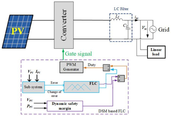 To illustrate the implementation of the proposed FLC based on DSM, a single-phase grid connected PV system is used as a case study. It has been compared with previous work in [2,30,31]. The advantages and limitations of the case study configuration are addressed in [2]. The case study employing the MPPT controller based on DSM is illustrated in Figure 9. It includes a PV array with a flyback converter followed by a current-controlled voltage source inverter. The flyback converter has been chosen for several reasons. For instance, the voltage is converted down to a value determined by the turns’ ratio during the off phase. This allows to choose a diode with smaller capacitances and therefore higher switching speed, a MOSFET with a much lower ON resistance can be used. Consequently, the power losses could be reduced leading to higher efficiency. Also, it has a wide input voltage range and provides isolation between the grid and PV due to the presence of a high-frequency transformer [35]. Moreover, no need to use a bulky transformer after the inverter to step up the voltage to the grid voltage. Besides, it does not have many components, thus it is inexpensive compared to other topologies and provides DC-DC at one stage instead of using multiple stages. However, it has a higher ripple current and higher input and output capacitance. Also, its efficiency is typically between 75% to 80% [36].