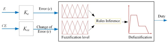 A normalized FLC is utilized as explained in Section 3.1 with two inputs, E and CE, and one output, duty cycle, as shown in Figure 11. The input scale factors, Ke and Kce will be changed based on the number of modules connected in series, such that Ke = ko/n and Kce = kco/n, where n is the number of modules, and ko and kco are the nominal scales for a single module and both are equal to 1. E and CE are computed from (8) and (9), while the number of membership functions and the rule base were illustrated in Figure 4 and Table 1, respectively.