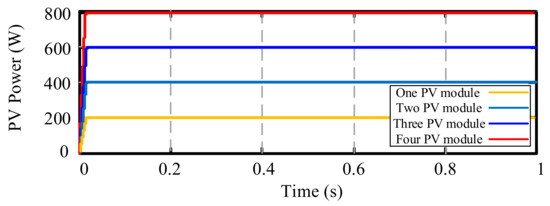 The DSM based FLC algorithm described in Section 3.3 is implemented in the case study for different module configurations. Figure 12 shows the PV power for a different number of modules operating at normal conditions, while Figure 13 illustrates the PV power for the DSM based FLC at partial shading situations. The results in Figure 12 are similar for both controllers at normal operations. By comparing the global maximum in Figure 10 with the results in Figure 13 during partial shading conditions, the output power is the global maximum. For example, in the case of 4 modules, there are 4 peaks and the global one is about 450 W that has been obtained by the DSM based FLC, while the FLC has detected the first peak of 200 W. So, there is a considerable difference in the total output power for the FLC based on DSM compared to the normal FLC in the case of multiple modules.