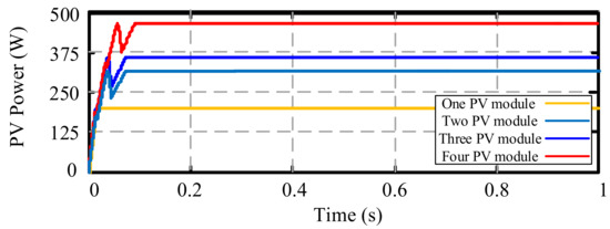 The simulation of the proposed technique has been carried out using the MATLAB/SIMULINK environment for the PV KYOCERA KC200GT module in different situations. The simulation results are presented to investigate the effectiveness of the proposed model and control algorithms of the single-phase grid-connected PV system. The PV power curves for a different number of modules at normal weather of 25 °C and 1000 W/m2, and partial shading conditions are shown in Figure 10. The proposed technique will be applied for the given case study based on the criteria in Section 3.