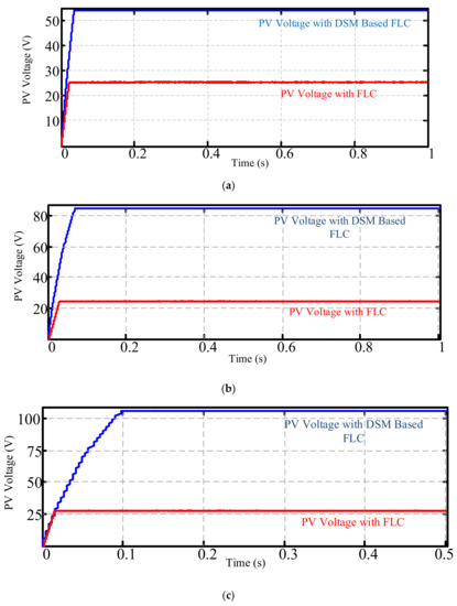 Figure 14 shows the output PV voltage for DSM based FLC and standalone FLC for multiple PV modules at partial shading conditions. The output voltage of the FLC controller stands still at the local maxima, 25 V and 200 W, which is the first maxima point. On the other hand, the DSM based FLC output voltage always catches the global maxima point. For example, in the four modules case, the voltage is 115 V, and the power is 450 W, which reflects the success of the proposed algorithm. The simulation results for different PV module configurations under shading conditions are summarized in Table 2.