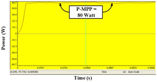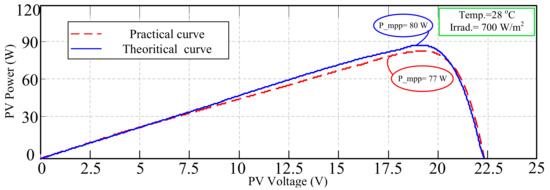 To verify the proposed technique, a laboratory PV system is prepared as illustrated in Figure 15. The control algorithms described in Section 3 are implemented on a 32-bit, floating-point, digital signal processor (DSP) type TMS320F28335 (TEXAS INSTRUMENTS, Dallas, TX, USA). The selected PV module is an 80 W NT-80 (E1) (SHARP, Osaka, Japan). The transformer of the flyback converter is an MYRRA-74070 ETD 44 120–160 W (MYRRA, Paris, France) and the flyback switching frequency is 50 kHz. Besides, the DC link capacitor is 470 µF, 250 V, while the current and voltage sensors are LA 100-P (LEM, Geneva, Switzerland) and LV 25-P (LEM, Geneva, Switzerland), respectively. The inverter is a grid micro-inverter type of 600 W (INSUPRA, Katy, TX, USA). The data are recorded using a TDS2024 200 MHz two Channels Digital Real-Time Oscilloscope (Tektronix, Beaverton, Orleans, LA, USA). The measured PV power curve and the simulated PV curve of the PV module are shown in Figure 16 with a maximum power of 80 W at temperature and irradiation of 28 °C and 700 W/m2, respectively. In the beginning, the practical PV curve from the datasheet has been addressed to determine the safety region, Φ, as in Section 3.2.