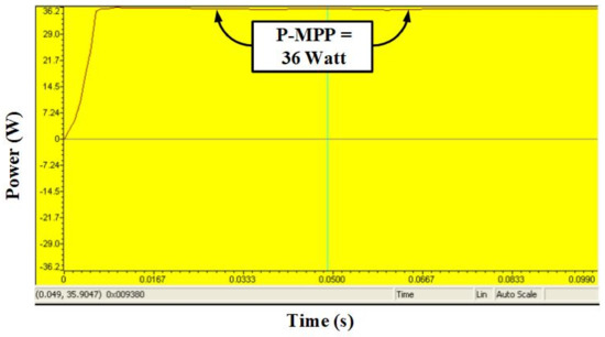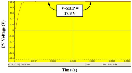 The classical FLC and DSM based FLC have been tested in normal and partial shaded modes, the results have been illustrated and compared. Figure 17 shows the Vmpp signal measured by the DSP at the normal operation for DSM based FLC method. The result shows the system’s ability to obtain an accurate maximum power from the PV module. Figure 18 shows the simulation results of a single module voltage of 17.8 V. It is almost the same voltage that has been obtained from the PV curve around 80 W in Figure 16. Figure 19 shows the PV curve at normal and partial shading conditions for the practical system, while Figure 20 and Figure 21 show the extracted power from the PV module under partial shading conditions employing FLC with DSM and standalone FLC, respectively. In the case of FLC, the power was nearly 36 W, which represents the local peak in Figure 19 or the first peak. While for the DSM based FLC, the power was approximately the same as the global peak of 80 W in Figure 19.