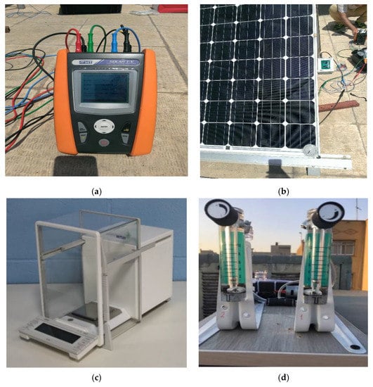 Two 260 W mono-silicon panels of German Solar World Company (Table 1) are used in the experiments. In order to measure power, voltage, and current of the PV panels, PVCHECKw Solar PV System Tester, and to measure solar radiation intensity, HT304N device which is calibrated in standard condition, are used. It is worth mentioning that tolerance of these devices is ±4% and ±3%, respectively. Moreover, to measure the dust settled on panel surfaces, Mettler AT201 digital laboratory scales with 0.1 mg precision is used. In addition, to collect the pollutants in the air, the ambient sampling pump machine with 1.5 L/m flow rate is used. The measuring tools used in the experiments are demonstrated in Figure 2.