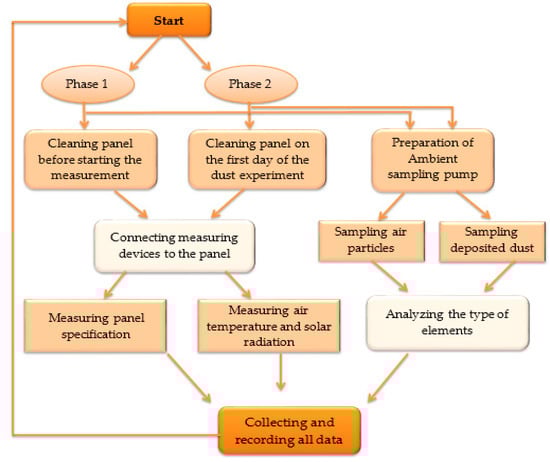 To clarify steps of the experiment in different phases Figure 3 is provided. It is worth mentioning that the diagrams of this paper which are related to the voltage-current and generated power, are obtained from the “PVCHECKw Solar System Tester” device and “Top view”. Moreover, the MATLAB software is used for drawing voltage-current changes for the dust deposited.