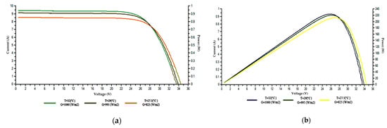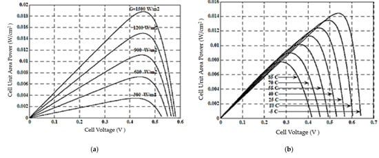 Effects of (a) solar radiation in constant 25 °C and (b) air temperature shift in constant 1000 W/m2 radiation on P-V characteristic curve [28].
