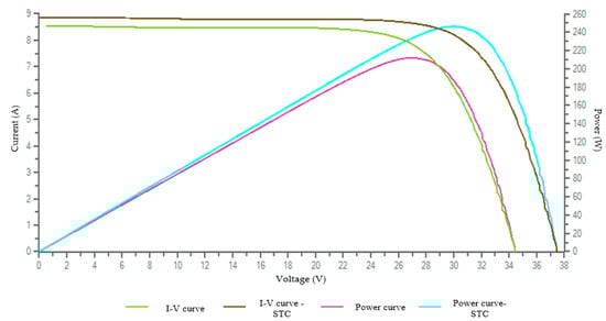 In Figure 6, voltage-current and generated power diagrams expected from the panel in STC and the first measurement in the morning on the first day (22 June 2019) of the experiment are shown.