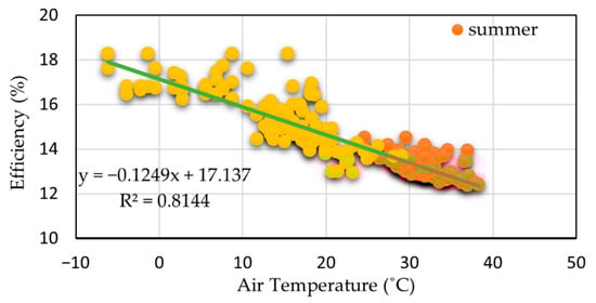 The variation of the PV efficiency for the first panel with 35° angle with solar radiation and air temperature is demonstrated in Figure 8 and Figure 9. The maximum PV efficiency is calculated during the winter season. As noted earlier, the presence of wind in winter help to keep PV temperature lower than in summer. As shown in Figure 8 and Figure 9, in the range of 650–750 W/m2 and the range of 5–10 °C maximum values of PV efficiency are obtained. The results show a correlation between output power with air temperature and solar radiation. It means increasing the air temperature due to the reverse effect on the panel’s performance reduces the output power. Furthermore, increase in solar radiation has increased the PV temperature which consequently reduced the short-circuit current. As the short-circuit current decreases, the efficiency of the PV also decreases. It is noted that, linear interpolation is used for Figure 8 and Figure 9 with R2 of 0.7651 and 0.8144, respectively.