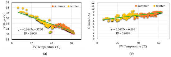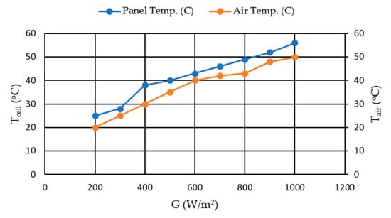 It is shown from Figure 4 that air temperature increment results in a linear decrement of open-circuit voltage, and increment of short-circuit current . However, open-circuit voltage is affected by air temperature more than others. Hence, due to dependence on I0 (Equation (4)), air temperature increment reduces the open-circuit voltage [28].