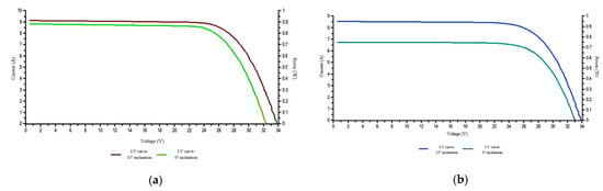 Also, Figure 12b shows and changes in winter. In this Figure, the effects of earth deviation and shifting of seasons and the importance of the panel installation angle on the panel specifications is completely clear. Based on formulas and descriptions in Section 3.1 and Figure 4 effects of solar radiation changes on Isc is in higher level. By reducing the radiation intensity in winter, Isc of the panel with angle of 35° is reduced. On the other hand, in addition to radiation intensity reduction, incapability of horizontal panel in solar radiation absorption due to inconformity with solar incidence angle has reduced the and . But this time the amount of reduction is less than summer because of the low air temperature. Thus, is reduced based on panel installation angle which changes the amount of solar radiation absorption.