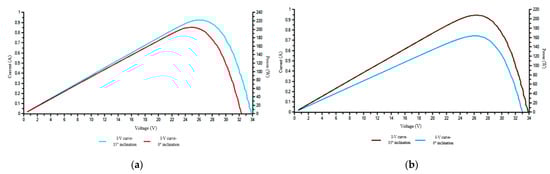 Power–Voltage diagram of tilted and horizontal PV panels. (a) summer, (b) winter.