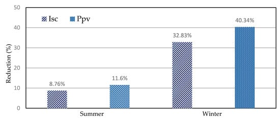 The results of measuring the specifications of the PV panels during the experiment period for investigating the effect of air temperature and solar radiation (from 22 June to 22 August and 23 September to 22 Novembe) are shown in Figure 14. This Figure shows the reduction of output power and short-circuit current of 0° panel in winter and summer as compared with 35° panels.