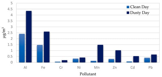 Figure 14 shows the average of the metals in the air particles in clean and dusty days that contain Al, Fe, Cr, Ni, Mn, Zn, Cd, and Pb. As shown in Figure 15, most of the particles in clean and dusty days are Al and Fe, but sampling carried out on dusty days indicates that the pollutants in the air have increased from 1.2 to 11.38 times. The remarkable point is that the highest change is related to Mn and Cd metals, which increased by 11.38 and 6.62 times, respectively. It is noted that, the least increase was 1.2 times that of Ni metal.