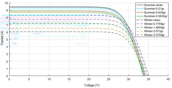 In Table 3, the variations of the short-circuit for 35° and horizontal panels in summer and winter are shown. It is shown that increasing accumulated dust, decreasing short-circuit current. The short-circuit current is reduced by 8.42% and 27.27% for 35° panel for summer (accumulated dust is 2.5633 g) and winter (accumulated dust is 3.3759 g), as compared with a clean panel, respectively.