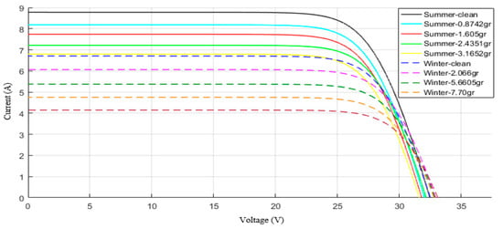 It is cleared from Figure 18, that the most important parameter affected by this natural factor is short-circuit current. As the amount of deposited dust increases, the amount of lost current also increases. Because the short-circuit current is due to the generation and accumulation of light carriers, which are actually obtained by photon absorption and the creation of electron-hole pairs. As the accumulation of dust on panel surface prevents light absorption by solar cells that leads to light-generated carries decrement, the short-circuit current decreased.