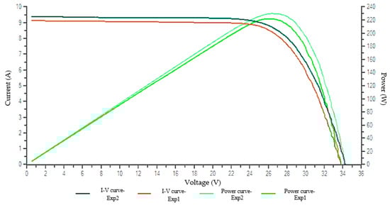 Comparison of V–I and generated power diagrams for tilted panel in experiments 1 and 2.