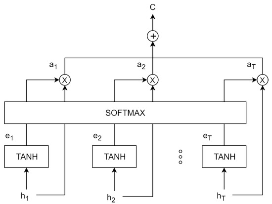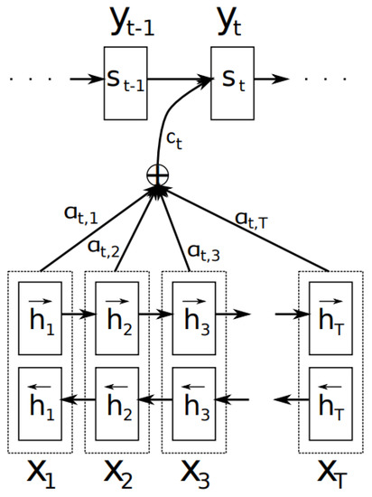 where f is a learned function that computes a scalar importance value for given the value of and the previous state and each attention weight determines the normalized importance score for . As shown in Figure 1, the context vectors are then used to compute the decoder hidden state sequence, where depends on , , and . The attention weights can be learned by incorporating an additional feed-forward neural network that is jointly trained with encoder–decoder components of the architecture.