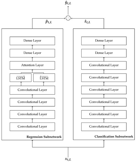 From a practical point of view, DNNs use partial sequences obtained with a sliding window technique. The duration of an appliance activation is used to determine the size of the window that selects the input and output sequences for the NILM modeling. To be precise, let and be, respectively, the partial aggregate and appliance sequences of length L starting at time t. In addition, we build the auxiliary state sequence , where represent the on/off state of the appliance i at time t. The state of an appliance is considered “on” when the consumption is greater than some threshold and “off” when the consumption is less or equal the same threshold. We use the notation for the partial state sequences of length L starting at time t. Our idea is to exploit the structure of the SGN architecture proposed in [17] as the building block of the model. This general framework uses an auxiliary sequence-to-sequence classification subnetwork that is jointly trained with a standard sequence-to-sequence regression subnetwork. The difference here is that we generate a more accurate estimate of the power consumption by performing the regression subtask with a scalable RNN-based encoder–decoder with attention mechanism. The intuition behind the proposed model is that the tailored attention mechanism allows the regression subnetwork to implicitly detect and assign more importance to some events (e.g., turning on or off of the appliance) and to specific signal sections (e.g., high power consumption), whereas the classification subnetwork helps the disaggregation process by enforcing explicitly the on/off states.
