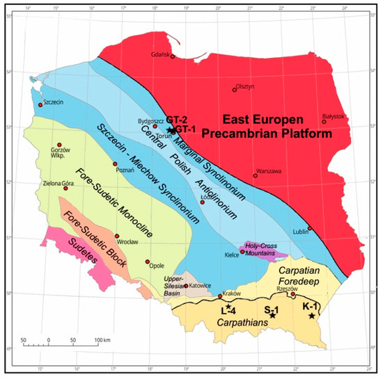 Location of boreholes in the study (GT-1, GT-2, K-1, S-1 and L-4) on the background of geological units in Poland; source: e-podreczniki.pl—modified.