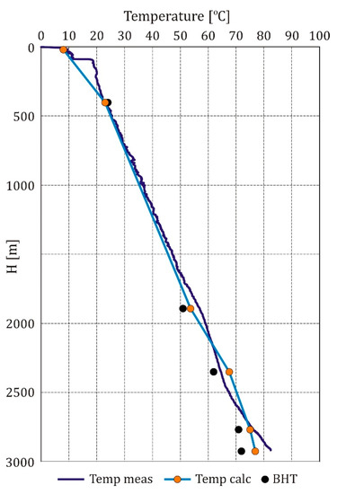 The special type of logs, important in geothermal investigations are borehole temperature measurements. Here, there is important to define the transient and stable/balanced state of temperature in the borehole and its vicinity. Because drilling fluids (mud, water) circulating in the borehole during the drilling process have a temperature different from the orogeny, the measured temperature of the borehole fluid is not the same as the rock formation. Time (several days or even months, depending on geological conditions) is needed to level up the temperature in the borehole and surrounding rock formation. The frequently met state when the temperature in the borehole differs from the temperature of the surrounding rock is named thermal quasi-equilibrium [31], unlike real equilibrium. Three basic types of temperature measurements in boreholes are considered. Nowadays, the most popular and made in all log runs is bottom hole temperature measurement (BHT) providing an actual temperature (of the borehole fluid) at the bottom of drilled and logged depth section, in the conditions of disturbed thermal equilibrium. Because drilling and logging are realized in sections the outcome of BHT comprises several values, which can be the basis for constructing the temperature log. There are also direct measurements of the transient temperature along the borehole axis in depth sections—thermal logs. They provide the current temperature necessary to make temperature corrections for other logs but also carry information on the orogeny temperature. The so-called stable/balanced temperature logs made in thermal equilibrium are used for thermal gradient determination. They are very important from the geological point of view and provide thermal data close to the real one, but are expensive and rather rare.