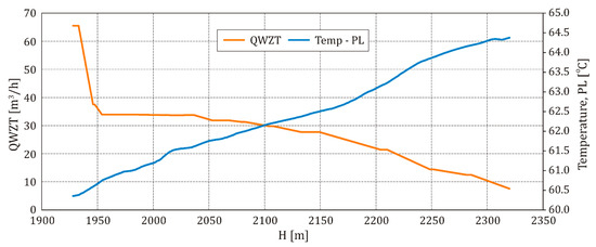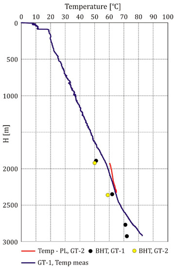 In the GT-1 borehole, in-depth interval 1894–2923 m, there was realized expanded set of logs comprising among others spectral gamma log, SGR, electric imaging with the use of X-tented Range Micro Imager (XRMI) device, and advanced sonic log using WSST tool. In this depth section, the Jurassic and Triassic clastic and carbonate formations were analyzed as the potential geothermal water reservoirs (Table 2). Production logging was realized in the GT-2 borehole, so direct measurements of outflow were available, together with the transient temperature log, Temp–PL curve (Table 3, Figure 2 and Figure 3). The presented cases were good examples to illustrate the usefulness of well logging in geothermal prospection and analyses. The temperature was measured as bottom-hole temperature (BHT) at the final depth points of logging runs (Table 3, Figure 2 and Figure 3). Based on the BHT measured values in the GT-1 borehole, calculated/aligned values of the temperature, Temp_calc were obtained using Horner plot [37,38]. The blue curve in Figure 2 may be the basis for the geothermal gradient determination. Figure 2 and Figure 3 also include a Temp meas log as the result of temperature logging in the GT-1 borehole after 13 days for getting temperature equilibrium.