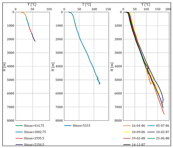 In Poland, in older wells, it is possible to find temperature logs that are aimed to determine geothermal gradient. Such established temperature measurements are cost generating because the credible records of the orogeny temperature can be obtained after a significant time lapse between the end of the drilling process/mud circulation and temperature logging. The importance and difficulty of the process of obtaining the temperature balance in orogeny are illustrated in Figure 5. Three plots T vs. H present the results of the interval temperature measurements in the very deep borehole K-1, in south-eastern Poland. Results of the four sections of the temperature measurements are presented in the left plot. In the middle part, the results obtained on the same day as the results presented in the left plot are presented (the same date: 16 April 1988). Hmax represents the depth of the bottom of the borehole section at each run. The results obtained on the same day are repeatable. The right plot illustrates changes in temperature curves measured after the different number of days of time-lapse (different dates). Temperature vs. depth curve logged on 19 February 1988 (brown) is the most credible for geothermal gradient determination. The green curve, logged later (25 June 1988) in a shorter section covers the previous one. Differences in courses of the curves T vs. H measured in the different dates illustrate the importance of keeping a long time-lapse in temperature measurements.
