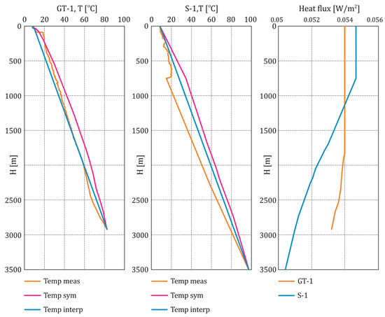Results of temperature and heat flux modelling in GT-1 and S-1boreholes; Temp sym—result of modelling, Temp meas—measured temperature, Temp interp—interpolated result of temperature simulation.