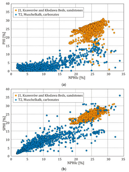 (a) Total porosity, PHI vs. neutron porosity after all corrections, NPHIc, GT-1 borehole; PHI of J1 sandstones reveals higher values, scattering of data is due to shaliness, PHI of T2 carbonates is generally lower than sandstones, scattering of data is related to intergranular porosity, fissures and fractures of carbonates. (b) GT-1; Sonic porosity, SPHI vs. neutron porosity after all corrections, NPHIc; SPHI of J1 sandstones is higher than of carbonates; data scattering is more distinctly visible in carbonates than in sandstones.