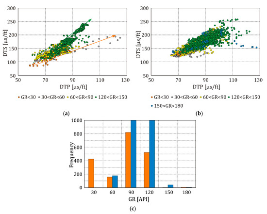 (a) Lithology differentiation on the basis of cross-plot S-waves (DTS) vs. P-waves (DTP), GT-1 borehole, TRe, Rhaetian (2335–2528 m); sandstones intercalated by mudstones and claystones; coloured scale related to gamma-ray (GR), orange line indicates sandstone, green—shales. (b) Lithology differentiation on the basis of cross-plot DTs vs. DTP, GT-1 borehole, TK, Keuper (2528–2752 m); clayey and muddy formations with calcareous and dolomitic substance; coloured scale related to GR. (c) GR data histogram; GT-1 borehole, TRe, Rhaetian (red), TK, Keuper (blue).