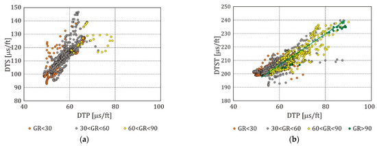 (a) Shear wave, DTS vs. longitudinal wave slowness, DTP cross-plot in T2, Lower Muschelkalk, 2798–2883.5 m; GT-1 borehole; low GR anomalies in carbonate rocks. (b) Stoneley wave (DTST) vs. longitudinal wave slowness, DTP cross-plot in T2, Muschelkalk and Tp3, Bunter Sandstone, 2771–2912 m; GT-1 borehole; increase of shaliness (green line) caused increase of DTST.