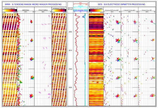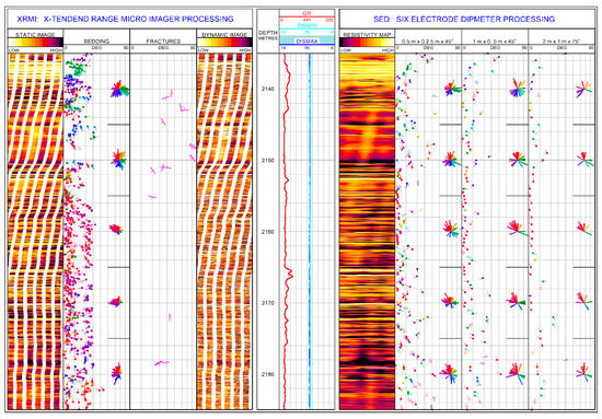 Sample of XRMI (left) and SED (right) plots after processing; GT-1, J2, Ksawerów and Kłodawa Beds, 2132–2182 m, thick-layered sandstones; bedding is distinctly visible in the static image of XRMI (first track) and Resistivity Map from SED (seventh track); dips are presented as coloured vectors in the second track—XRMI and eighth-tenth tracks—SED; coloured azimuth roses (second track—XRMI and eighth-tenth tracks—SED) show the dominating dips and azimuths; groups of fractures resulted from processing of XRMI image are in the third track; depth is marked in the fourth track; in the fifth track—GR and two calipers, DISMIN and DISMAX are presented; results of SED processing with different parameters are shown in the next tracks: eighth—0.5 m × 0.25 m × 45, ninth—1 m × 0.5 m × 45 and tenth—2 m × 1 m × 75; colour scale in the Static and Dynamic images and Resistivity Map is related to lower (darker) and higher (lighter) resistivity.