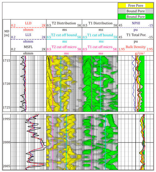 Selected sections of curves illustrating the resistivity and NMR logging results in the shaly-sandstone (upper part) and carbonate (lower) formations (L4 borehole in the Carpathian Foredeep; first track—measured depth, second—three resistivity logs: MSFL-the shortest radius of investigation resistivity log, LLS-middle and LLD-deep radius of investigation, third and fourth tracks—T2 and T1 distributions with cut-off lines separating the pore space occupied by clay water (to the left from rose line), capillary water (between rose and blue lines) and free water (to right from blue line), fifth track—results of the interpretation of the NMR log: yellow area-free pore, dynamic porosity, grey-bound pore, green-micro pore, blue line—neutron porosity, red—bulk density, black-total porosity from T1.