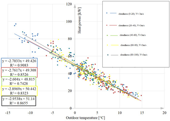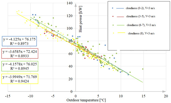 In this process, the correlation equations were used for four sun exposure ranges (0–35 J/cm2, 35–100 J/cm2, 100–200 J/cm2, and >200 J/cm2) and five cloud cover ranges (0–20%, 20–40%, 40–60%, 60–80%, and 80–100%), which were worked out as part of the calculations in Section 3.1. Using these correlation equations, the values of heat power delivered to buildings were determined for the outdoor temperature range of −20 °C–10 °C (see Table 4).