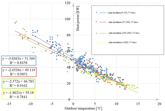 Then, taking into account the fact that the correlation equations were determined for specific data, the mean insolation was calculated for each of the ranges from which the correlation equations were determined. Lastly, the largest possible logical range was selected (i.e., when an increase in solar insolation leads to a decrease in heat power, and an increase in cloudiness leads to an increase in heat power).