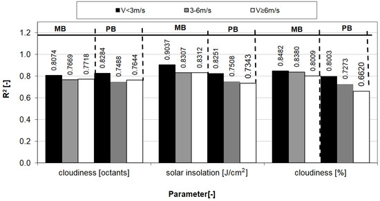 On the basis of Figure 4, the mean values of the determination coefficients for cloudiness in octants and cloudiness in percent were also compared. Cloudiness in percent showed visibly higher R2 values for residential buildings, and this was the case for v ˂ 3 m/s, 3 ≤ v ˂ 6 m/s, and v ≥ 6 m/s. For example, for wind speeds below 3 m/s, R2 for cloudiness in percent is greater by 5.05% than R2 for cloudiness in octants.
